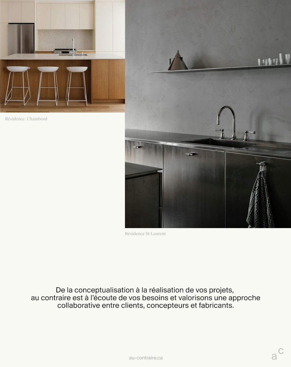 On a travaillé avec au contraire , un studio spécialisé en aménagement résidentiel et commercial, pour l’aider à définir son langage visuel. Comme sur plusieurs de ses chantiers, on a gardé la fondation (de son identité) et construit par-dessus — en misant sur les détails, l’utilisation d’éléments existants et l’ajout de gestes graphiques subtils, on a donné vie à une identité à la fois solide et délicate.