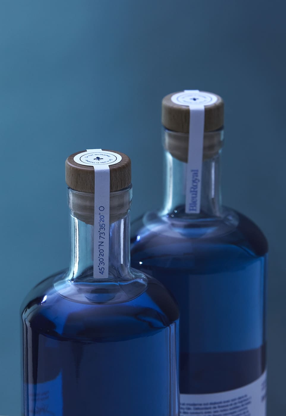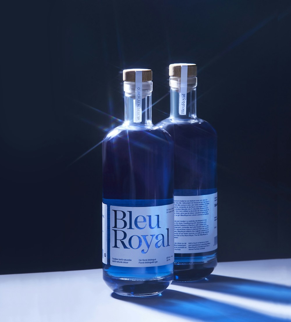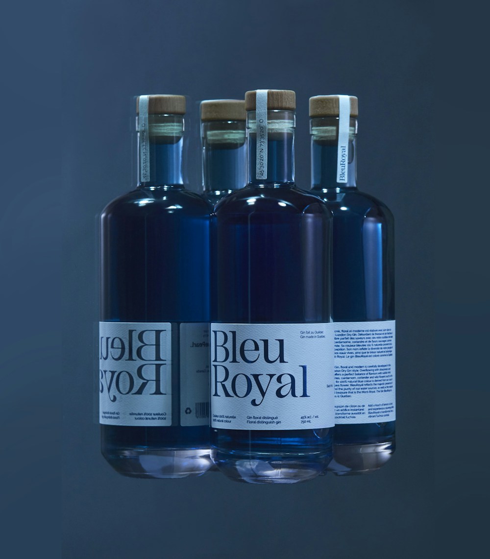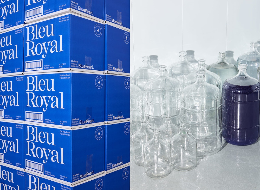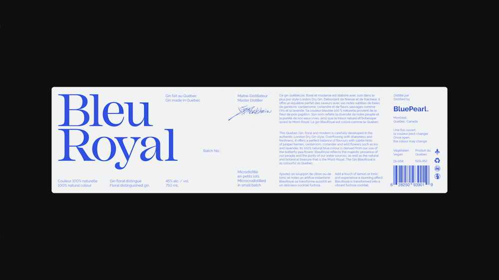 Premier produit de la Distillerie montréalaise BluePearl, ce gin se démarque d’abord par sa couleur bleu intense. L’identité a été réfléchie pour être raffinée et délicate, à l’image du gin. Le tout restant actuel, simple et moderne avec un système graphique de grille organisé dans sa déconstruction.