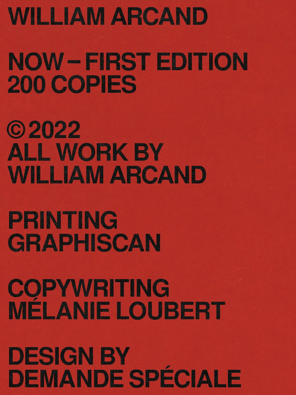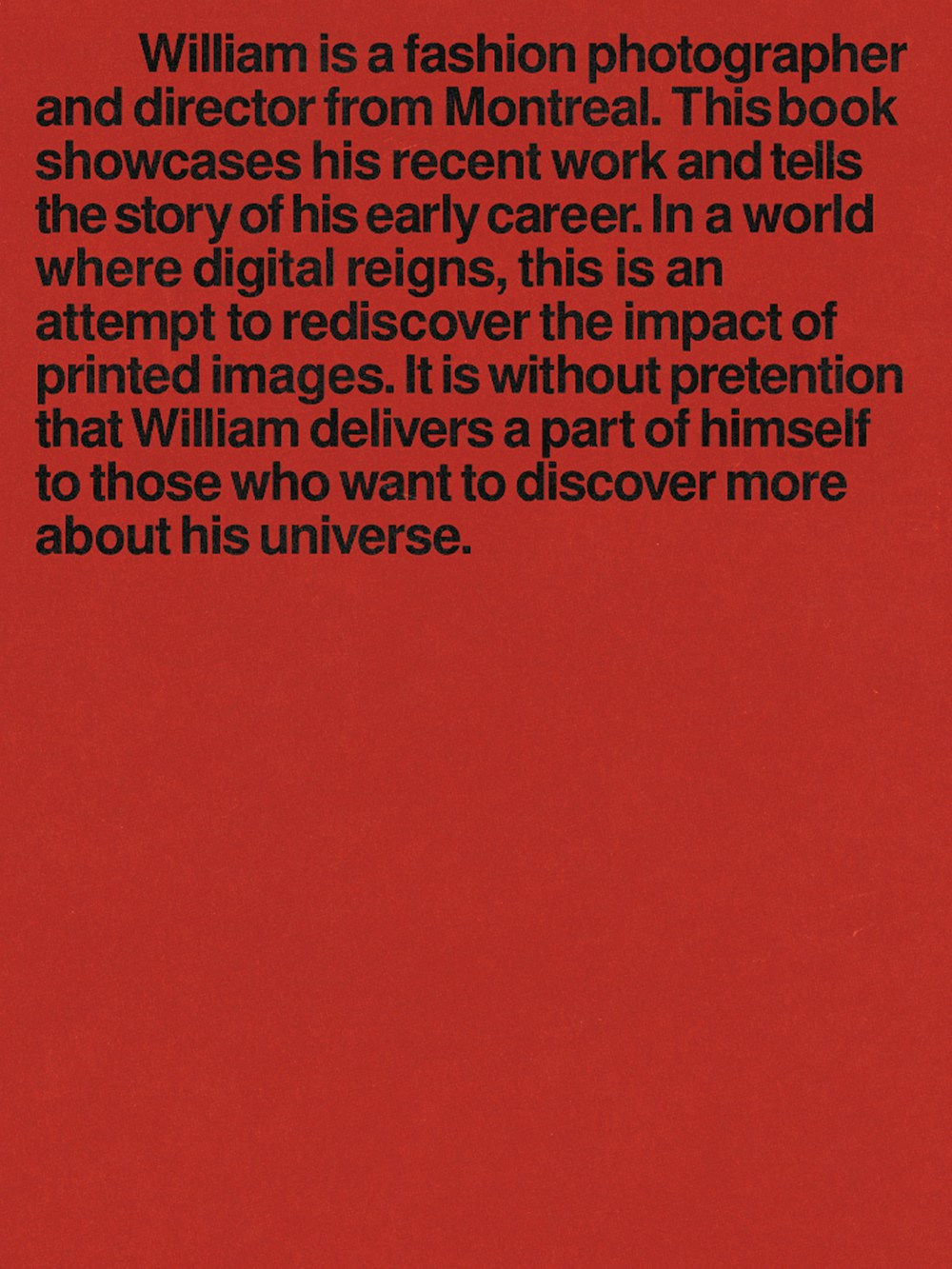 William est photographe de mode et réalisateur de Montréal. Ce livre présente son travail récent et raconte l'histoire de ses débuts de carrière. Dans un monde où le numérique règne, c'est une tentative de redécouvrir l'impact des images imprimées. Une pièce qui présente son travail de manière tactile.
